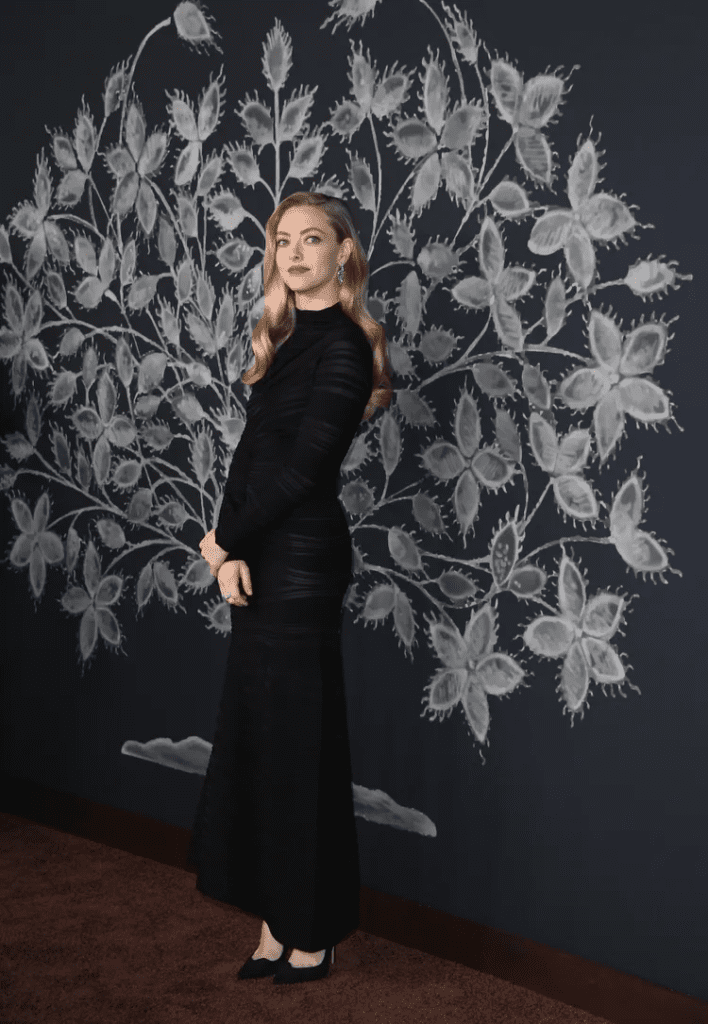 Her beauty look elevated the entire moment. Seyfried wore a bold red lip, smoky burgundy eyeshadow, and a soft peach flush that warmed her complexion. Her long blonde hair was styled in deep, side‑parted waves reminiscent of Old Hollywood icons, and she completed the look with emerald drop chandelier earrings that added a luxurious pop of color. The combination of classic glam and a modern, daring dress created a red‑carpet moment that felt both fresh and cinematic.