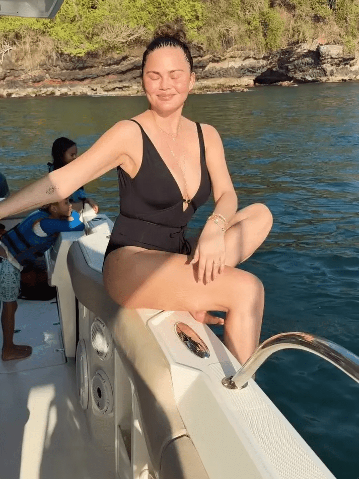 In one standout shot, Chrissy posed confidently on a boat in a plunging black swimsuit, her kids Luna, 9, and Miles, 7, standing behind her in life jackets as they peered over the edge. Their younger children, Esti and Wren, both 2, also appeared in other adorable family moments.