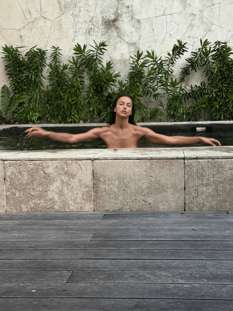 One of the most striking images showed Shayk submerged nude in a concrete‑rimmed pool. With her arms stretched wide and her shoulders glistening in the sunlight, the photo captured both serenity and strength. It was a bold yet artistic shot, emphasizing her confidence and the effortless allure that has defined her career. Fans quickly praised the image, noting how Shayk continues to push boundaries while maintaining elegance.