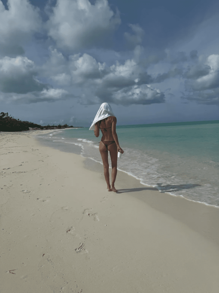 Her styling was relaxed yet chic. Wavy beach hair pulled back with a towel or claw clip, glowing skin kissed by the sun, and designer sunglasses completed the looks. Each photo reinforced her ability to make even the simplest beachwear appear high fashion.