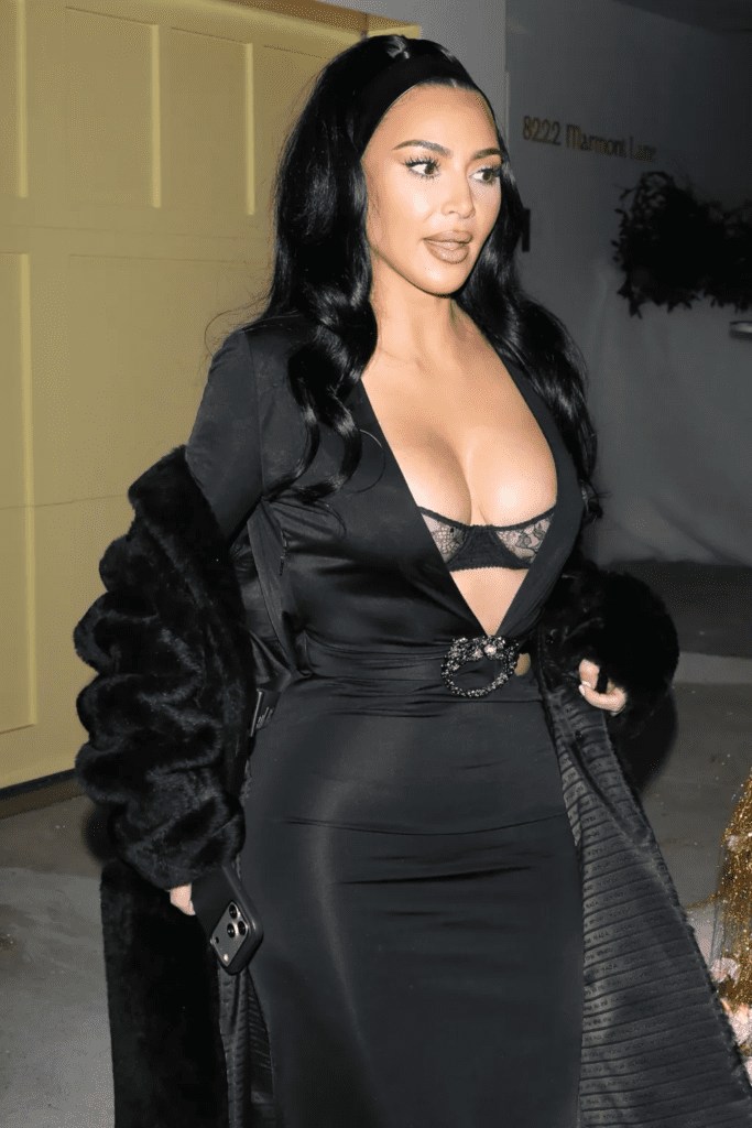 To complement the daring dress, Kim opted for flawless glam. Her glossy brunette hair was styled sleek and straight, cascading down her shoulders to frame her face. Makeup was icy‑toned, with frosted eyeshadow and a nude lip that balanced the sultriness of her outfit. The overall effect was polished yet provocative — a perfect blend of holiday sparkle and Kardashian signature style. By keeping her beauty look understated, she ensured that the focus remained firmly on the dress, allowing the lingerie‑inspired details to shine. It was a calculated choice that elevated the entire ensemble, proving that Kim understands the art of styling as much as she does the drama of fashion.