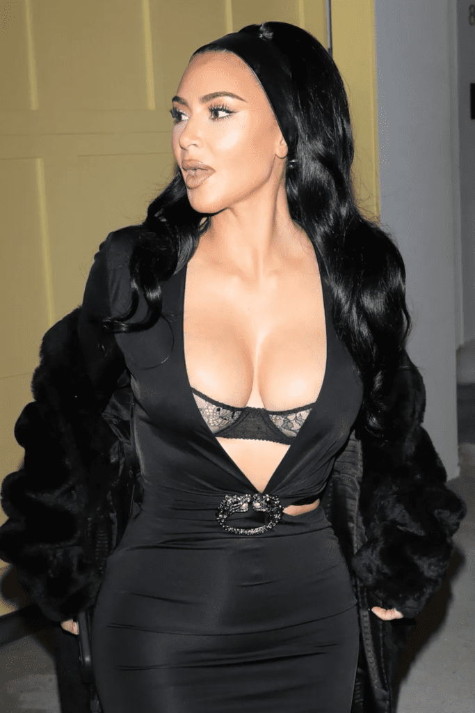 The ensemble itself was a masterclass in balancing risk with refinement. The plunging neckline exposed nearly her entire torso, while the lace bra peeked through, adding a provocative edge. Cut‑out details gave the gown a lingerie‑style vibe, blurring the line between boudoir chic and red‑carpet glamour. The figure‑hugging silhouette emphasized Kim’s famous hourglass shape, while the daring neckline narrowly avoided a wardrobe mishap. Yet, as always, Kardashian carried the look with confidence, proving that she thrives on pushing boundaries in fashion. Her outfit was not just clothing — it was a statement of empowerment, sensuality, and fearless self‑expression.