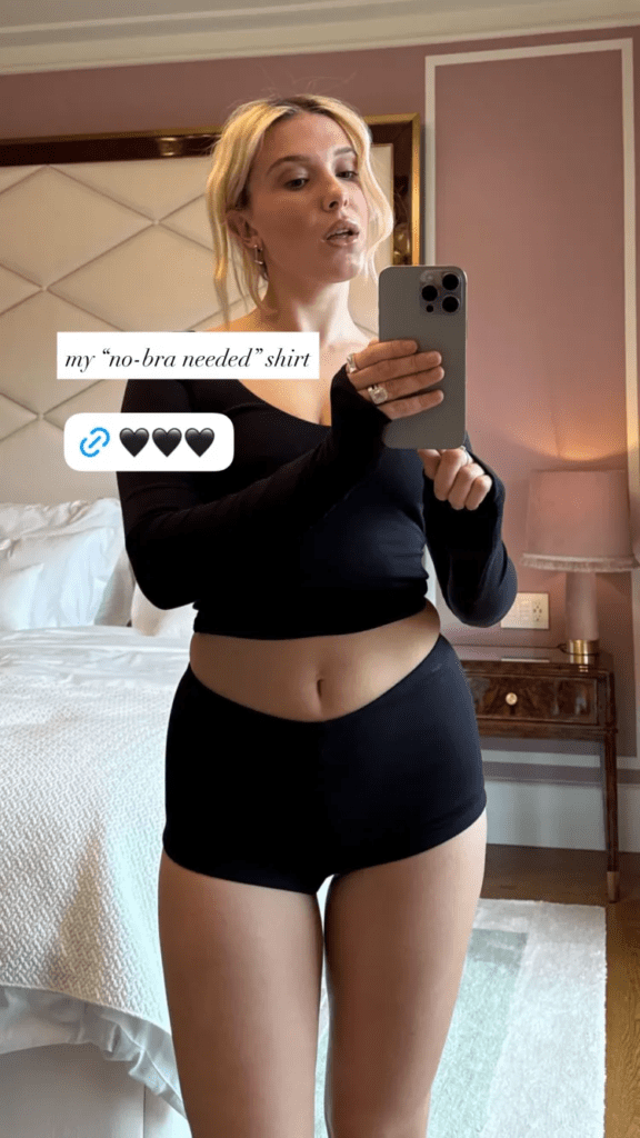Her first look? A black crop top and boy shorts, which she cheekily captioned her “no‑bra needed” shirt. The mirror selfie instantly grabbed attention, showing off her confident, playful style.