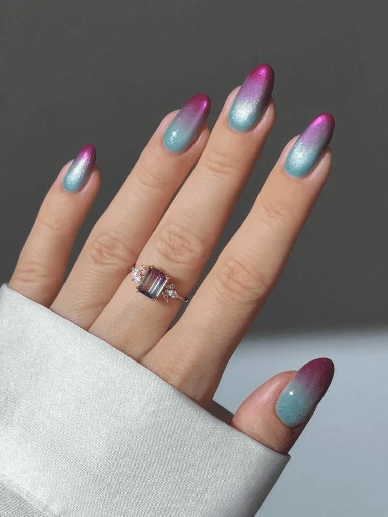 This design blends from a rich berry color into a soft blue. The colors change slightly in different light, which makes your nails look cool and unique.