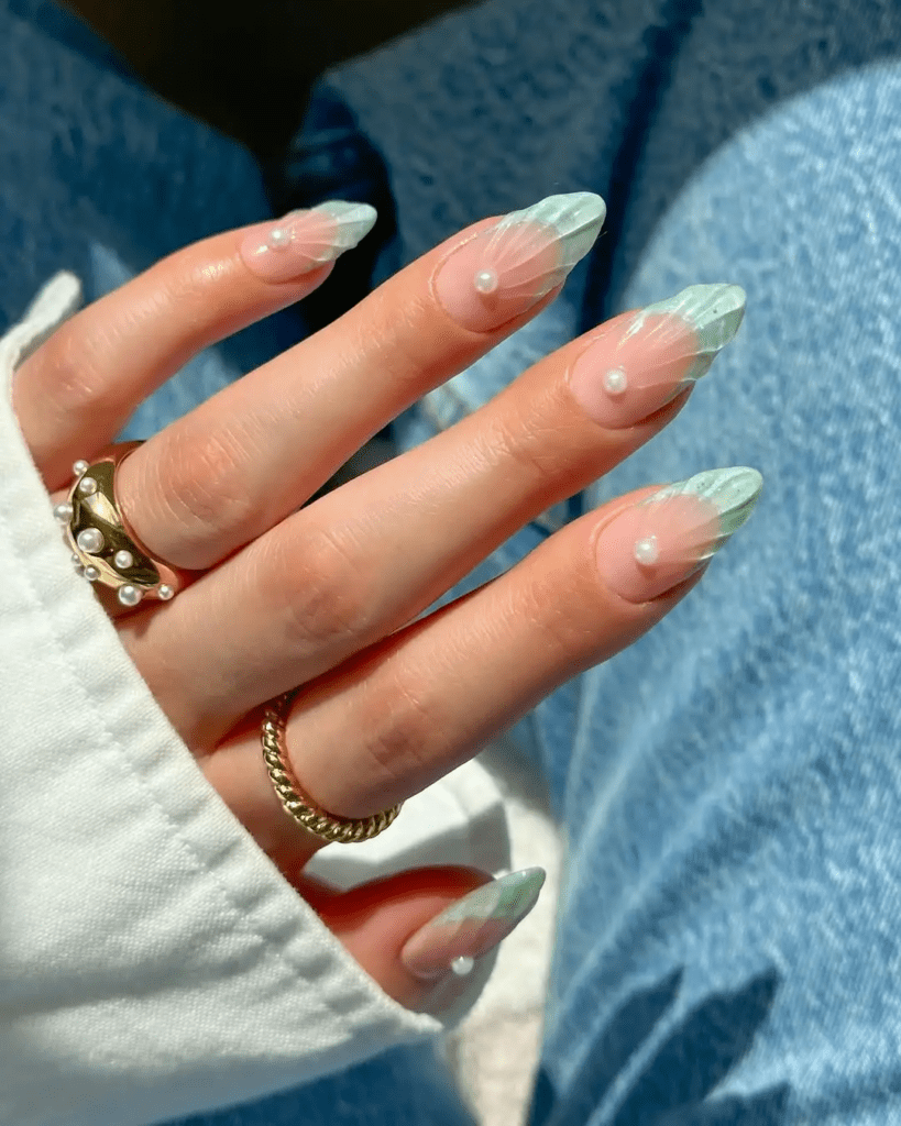 Think soft mint green nails with a small seashell design and maybe a tiny pearl detail. It gives a light ocean-inspired feel.
