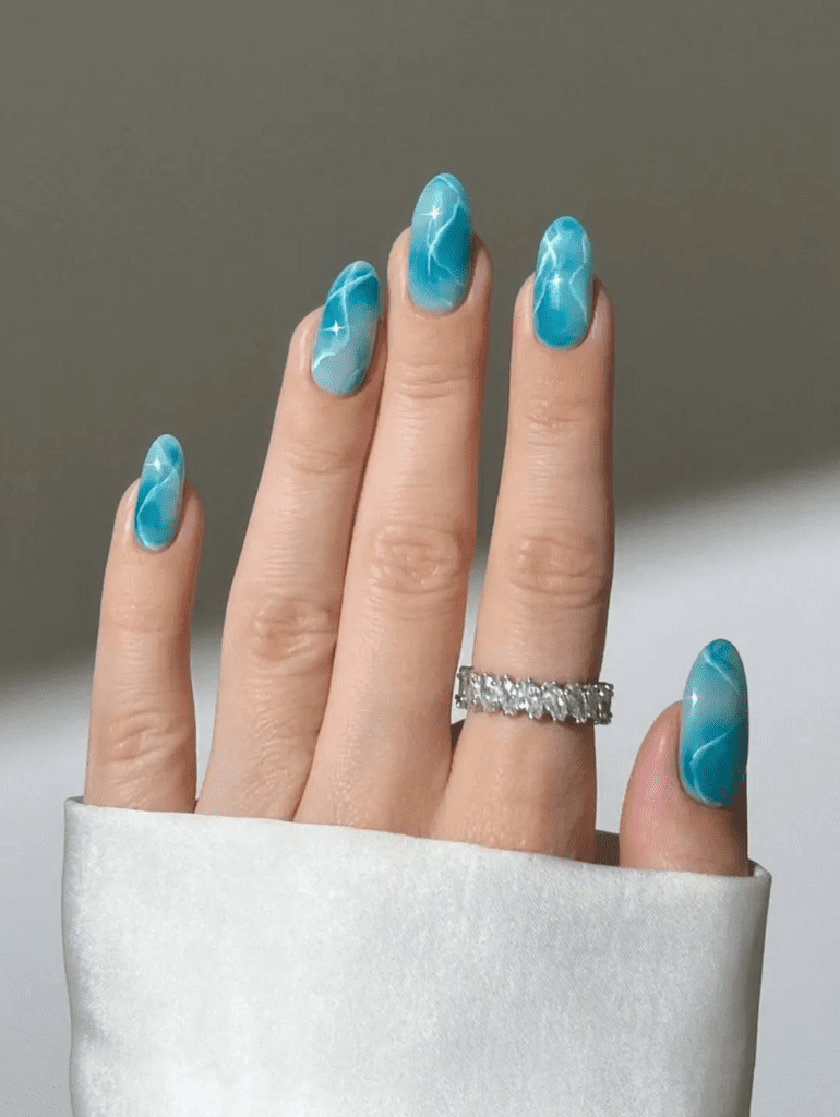 These nails have a soft blue marble effect with white lines that look like ocean waves or stone patterns.